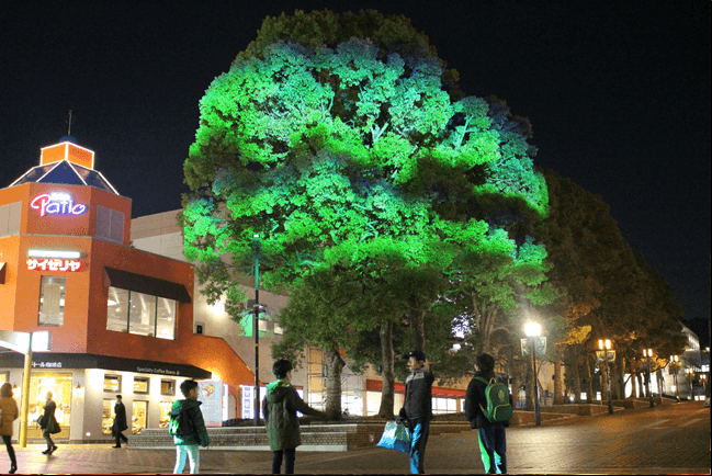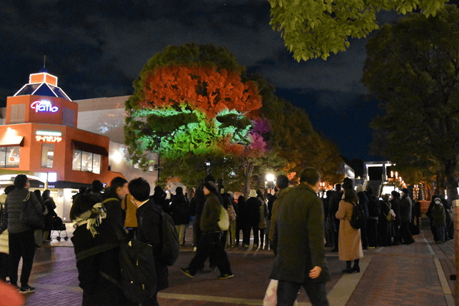 開催場所となるパルテノン大通り十字路は、多摩センターの特徴である完全歩車分離の遊歩道。街路樹から路面までまちに広がる光と影の約6分間のファンタジーを、お子様からご高齢の方まで、ご家族みんなで安心してお楽しみいただけます。