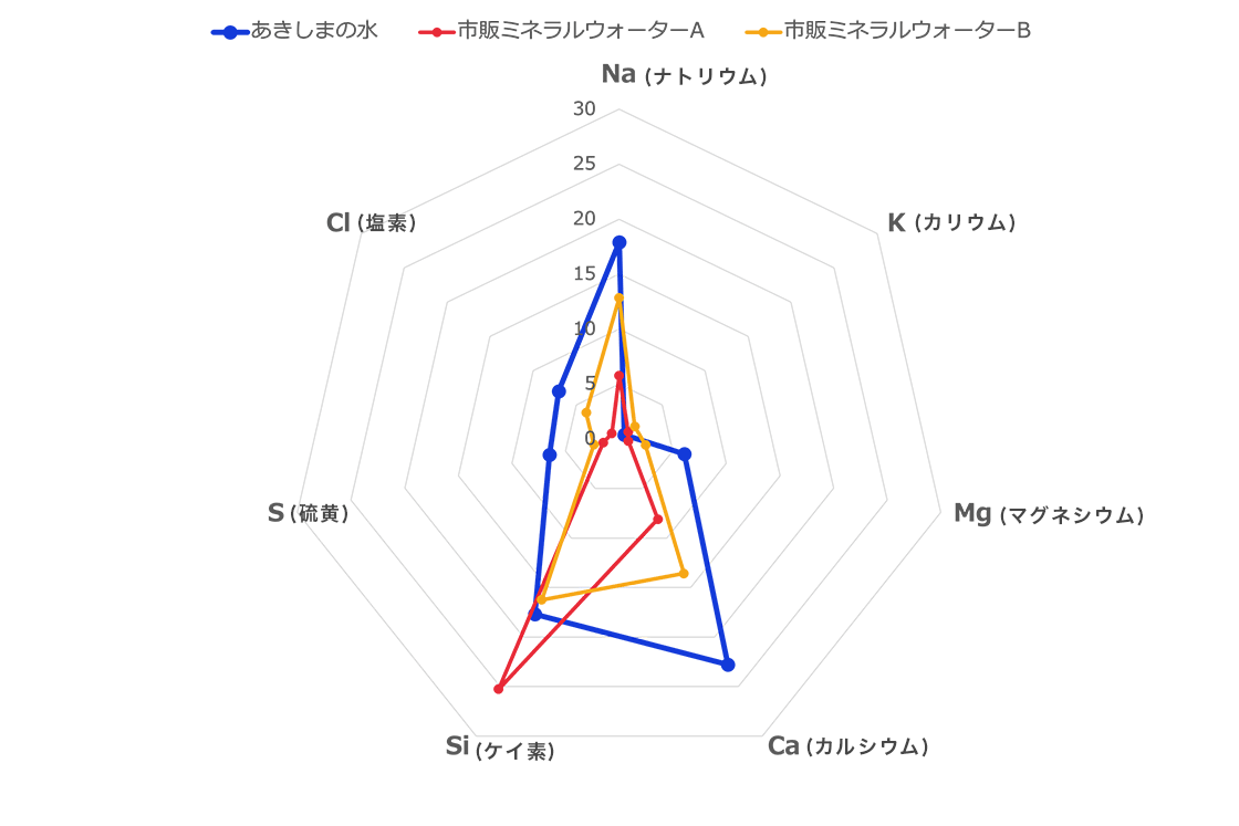 (1) 「あきしまの水」を分析し、市販の国内ミネラルウォーターと比較