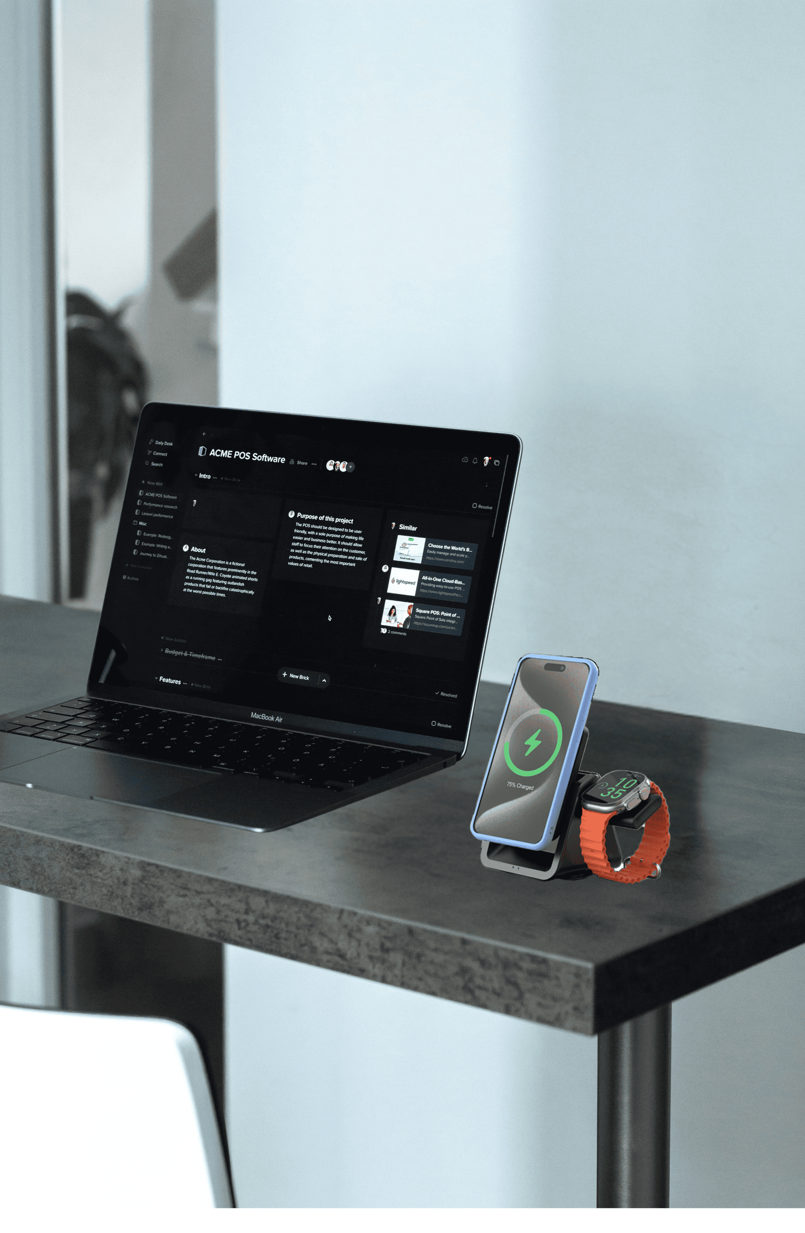 iPhoneシリーズやAndroidシリーズにも対応したAll in 1タイプの充電スタンドへ、小型軽量化と角度設定の操作性を兼備した、新発想のモバイルバッテリーが完成いたしました。