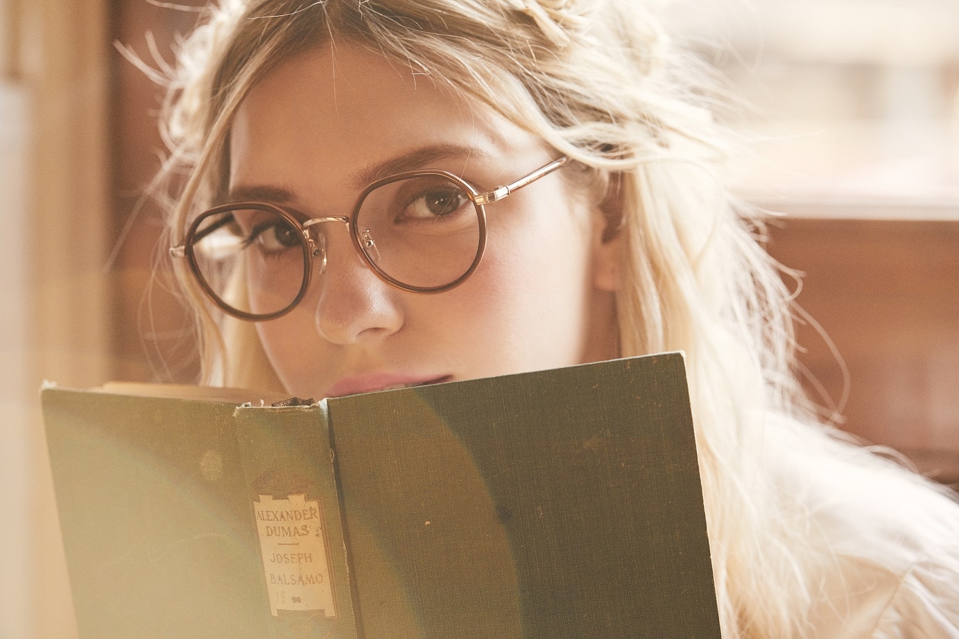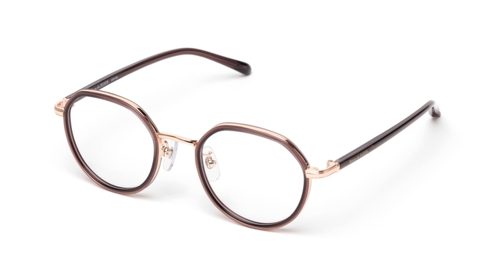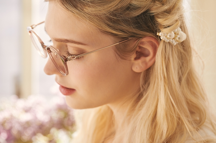 レンズ枠がプラスチック、テンプルがメタルのコンビネーションフレーム。ボストン型のレンズシェイプで、テンプルの丁番部分には花かんむりをイメージした飾りを施しました。