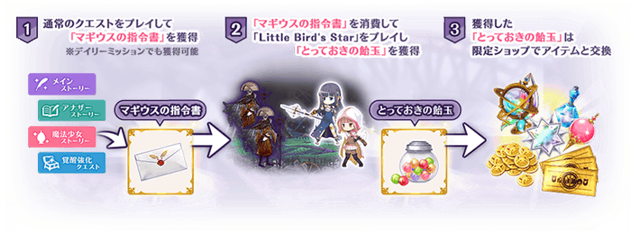 「マギウスの指令書」を消費すると本イベントのクエストをプレイでき、限定アイテムや覚醒素材と交換できる「とっておきの飴玉」を獲得できます。