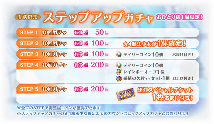 ※『有償限定 ステップアップガチャ 黒江編』の★4魔法少女確定までのカウントは『期間限定 黒江 ピックアップガチャ』とは異なります。