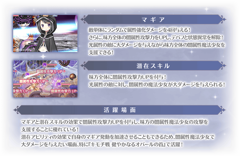 ・魔法少女やメモリアのスキル内容・効果は事前告知の上、変更する場合があります。