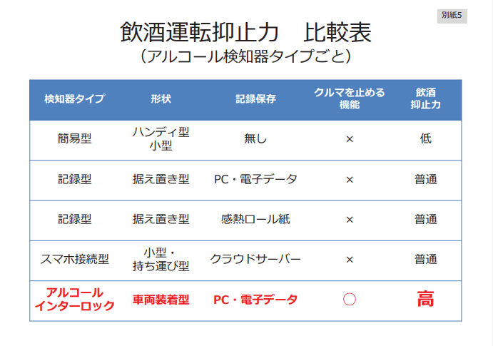 このなかで、アルコールインターロック等、車載タイプも、アルコール検知器の一種であるとされました。(別紙 4)