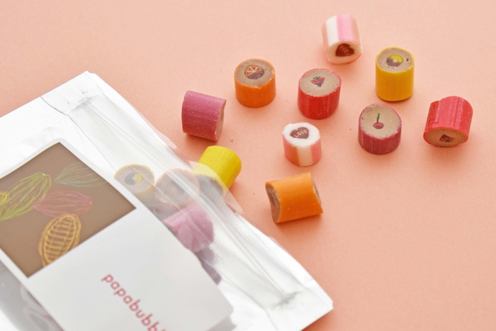 パパブブレの定番フルーツキャンディにチョコレートを合わせました。ココアパウダーが入ることでチョコレートの濃厚な味わいとフルーツの酸味が絶妙にマッチ。職人が何度も調整を重ねた自信作です。