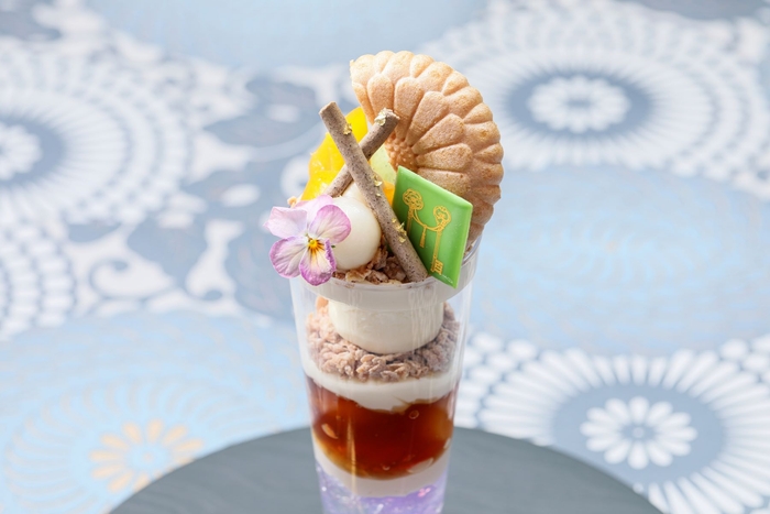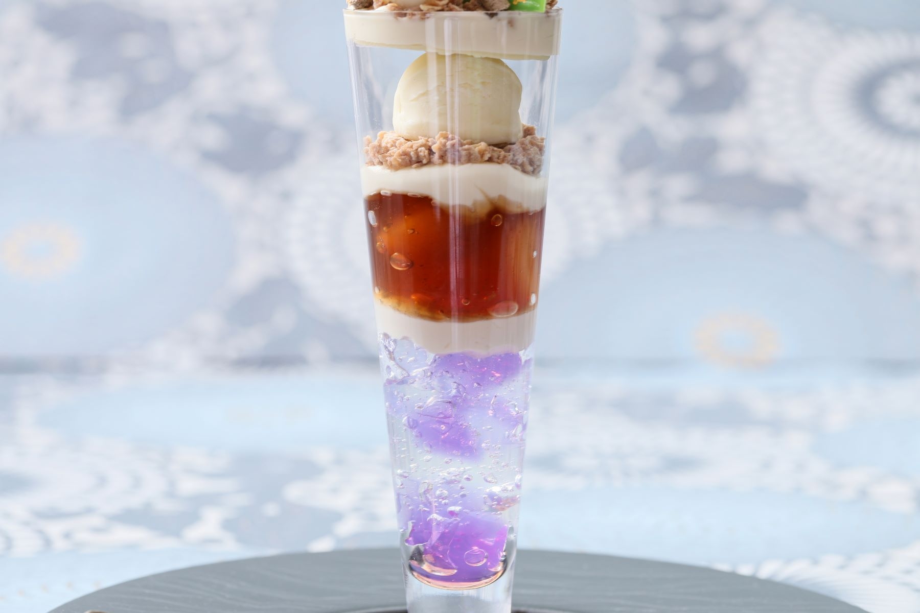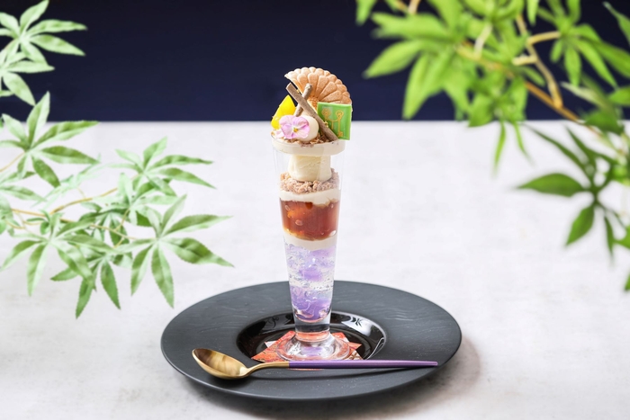 ■商品概要:今回の大人のご褒美パフェは“日本茶”が主役。パフェの最上段には、“香小町”という名の煎茶のアイス、“雁が音ほうじ茶”の棒メレンゲ、白玉や最中など、和のテイストで統一。煎茶のアイスは、茶葉をこさずにそのまま使用することで、煎茶の味をしっかりと感じていただけるパティシエ一押しの一品に。ひんやりミルクアイスやザクザク食感のホワイトチョコクランチ、ほうじ茶のジュレやあんずのコンポートなど、食べ進めるにつれて味や食感の変化をお楽しみいただけます。最下部には、パープルカラーが美しい、はちみつレモンのジュレと寒天を配置。最下部にすっきりとした味わいの食材を取り入れることで、最後の一口までくどさが無く、美味しくいただけます。