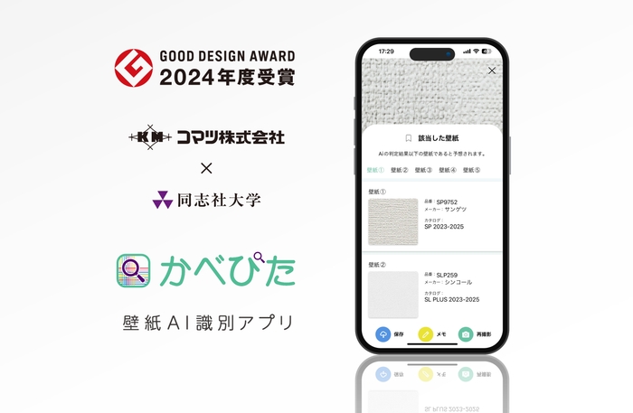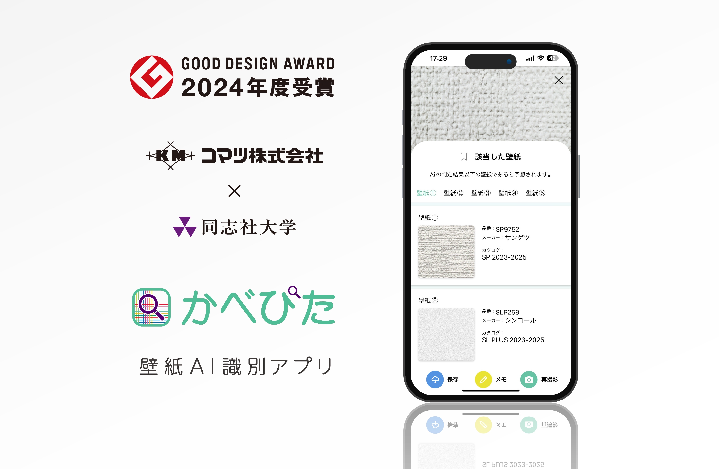 コマツ株式会社(本社:大阪府東大阪市、代表取締役:小松 智)と、同志社大学 理工学部 インテリジェント情報工学科 知的機構研究室(教授:奥田 正浩)が共同開発した「自動テクスチャ識別プログラム」を搭載した壁紙AI識別アプリ「かべぴた」が、このたび2024年度グッドデザイン賞(主催:公益財団法人日本デザイン振興会)を受賞しました。