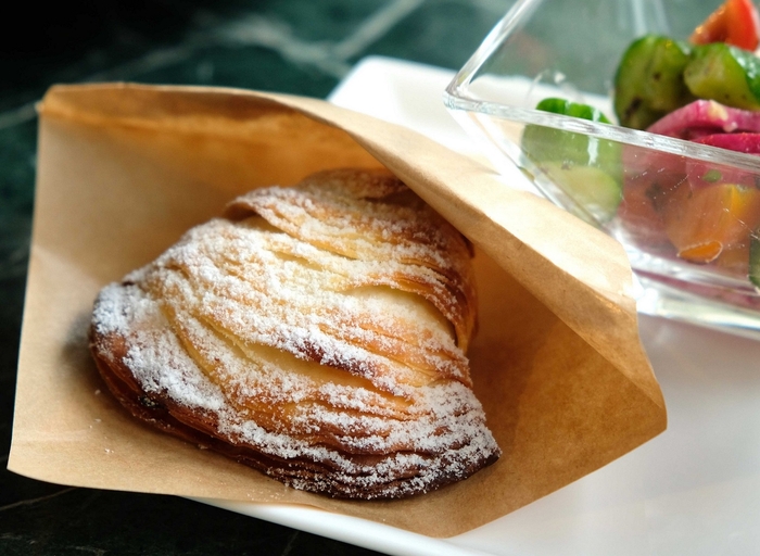 貝殻の形をした「スフォリアテッラ」はシェフの菊池が生地のサクサク食感にこだわり、何度も試作を重ねて完成した自信作。中にはオレンジの香りが爽やかなリコッタチーズを使ったクリームが入っています。
