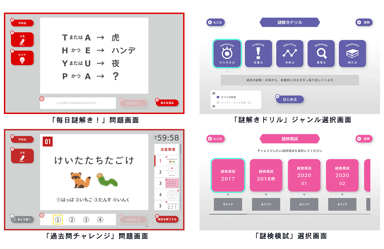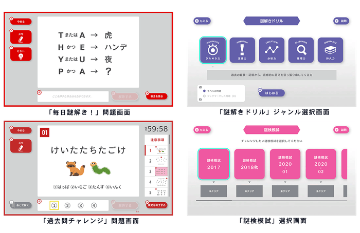 本作は、ゲームソフトであることを活かしてバラエティ豊かな4つのモードで謎解きをお楽しみいただけます。モードは一日一問の出題と解説で気軽に楽しめる「毎日謎解き!」、苦手なジャンルを集中的に解いて克服するための「謎解きドリル」、本試験と同じ形式で過去問に挑む「過去問チャレンジ」、そして他モードで出題されない問題を通して実力を測れる「謎検模試」の計4モード。「過去問チャレンジ」「謎検模試」の問題は、それぞれ20、50、100問1組の構成となっており、本試験の雰囲気を味わいながら過去問の傾向を掴む「謎検」の受検に向けた学習ツールとしておすすめです。