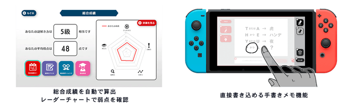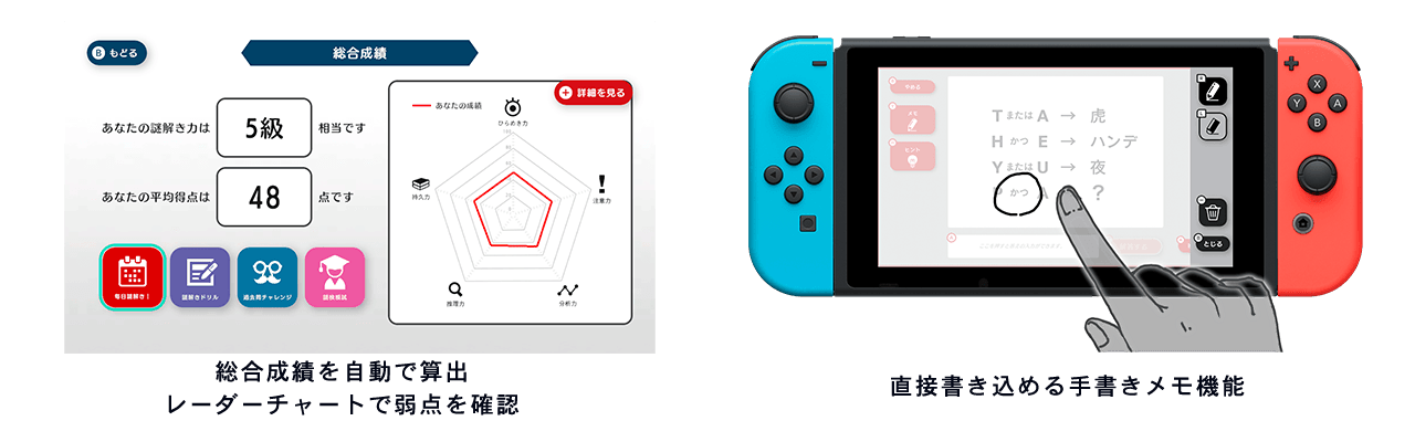 また、Nintendo Switch™のタッチ機能を活かした手書きメモ機能を搭載。書き込みを要するような問題でも、筆記用具を用意することなく、いつでもどこでも気軽に謎解きを楽しんでいただけます。