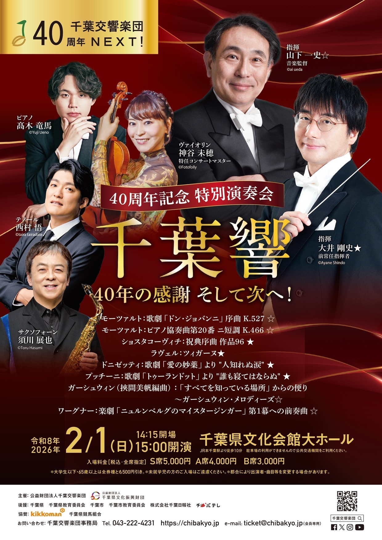 創立40周年を迎えた公益財団法人千葉交響楽団は、2026年2月1日(日)に特別演奏会「千葉響 40年の感謝 そして次へ!」を開催します。皆様への感謝を込めて、多彩なゲストを迎えて、豪華な曲目を披露します。