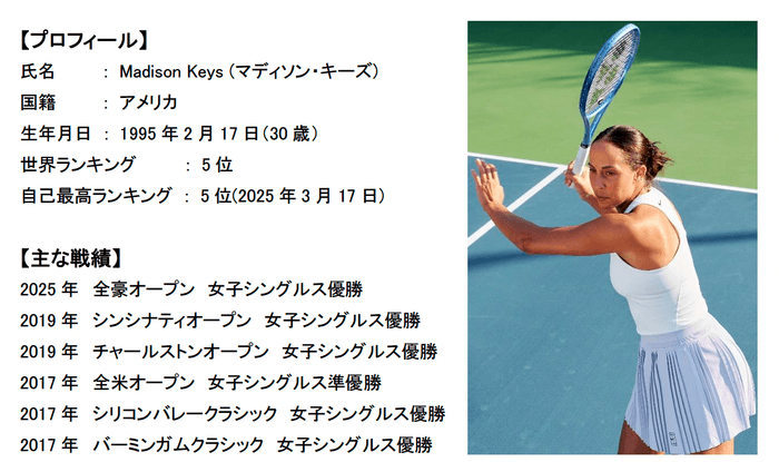 ヨネックス株式会社(代表取締役社長:アリサ ヨネヤマ)は、世界ランキング5位※のマディソン・キーズ選手と、2025年3月より用具使用契約を締結いたしました。