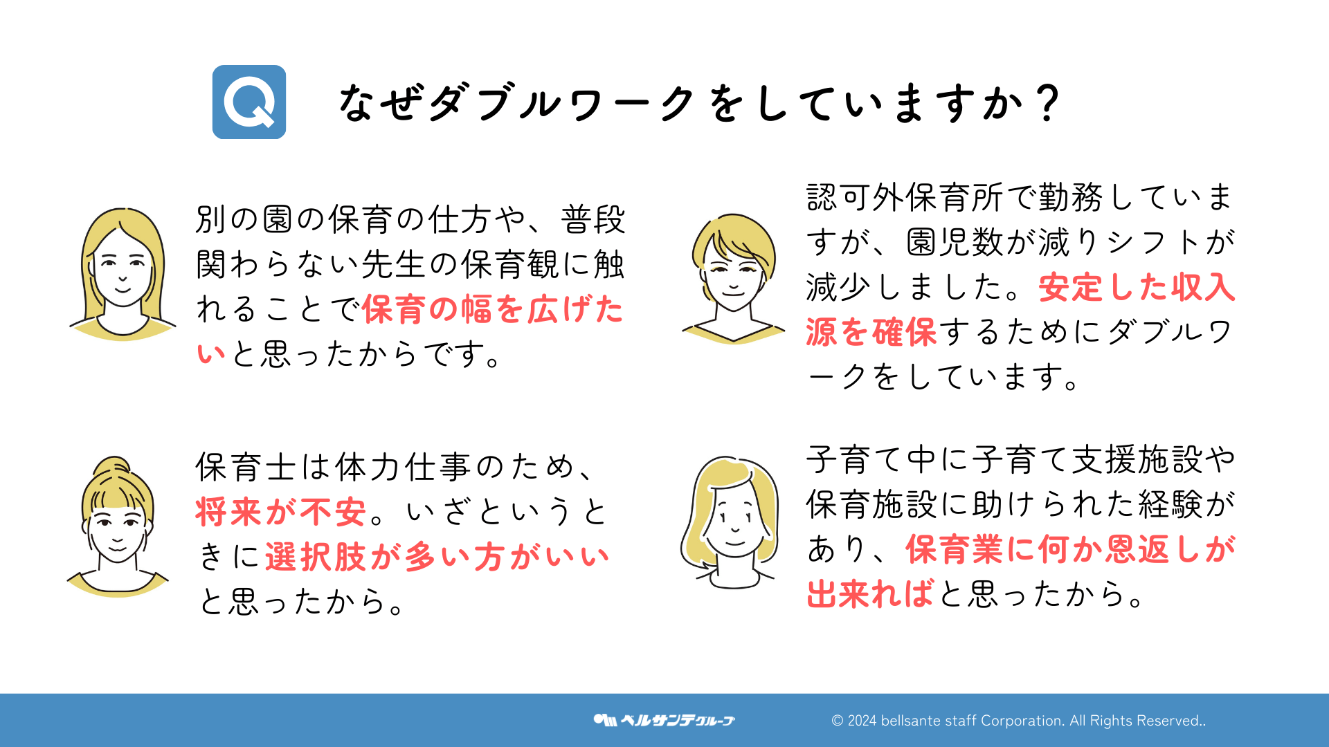 ・「派遣なので、ダブルワーク先の園を定期的に変えながら新たな保育観に触れたい。ダブルワーク自体は私の働き方にあっているので継続したい」