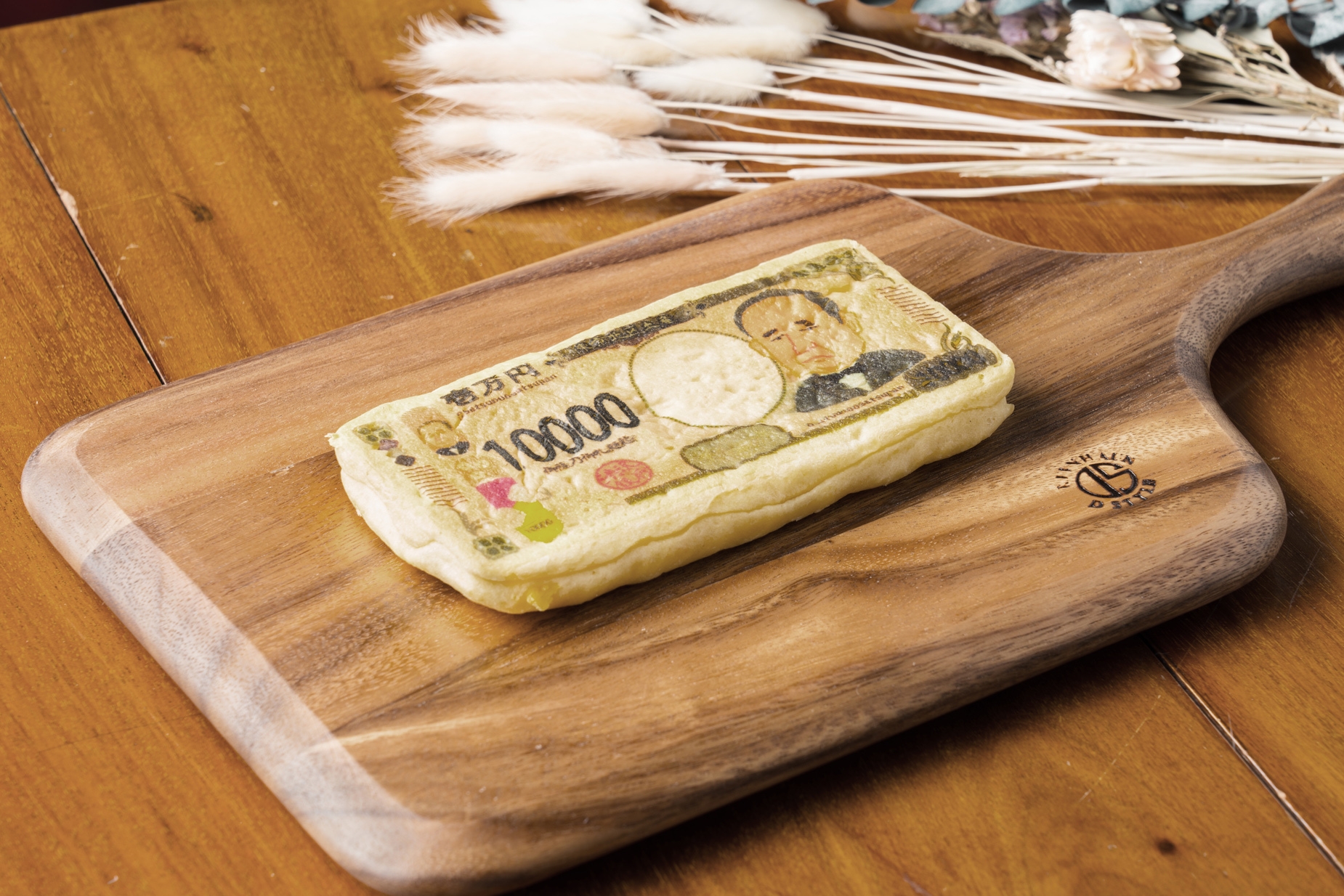 7月に20年ぶりにデザインが改刷される渋沢栄一翁肖像の新一万円札を模した日本初の一万円札パンです。「お札=おさつ=さつまいも」という連想から、中には自家製のスイートポテト餡とさつまいも甘露煮がたっぷり詰まっています。本物の一万円札と同じサイズ160mm×76mmに仕上げ、厚さは10mm強に。帯封もされ、まさに100万円札束を再現したパンです。