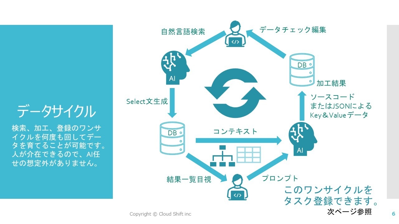 このデータサイクルを繰り返すことによりAIによって新たな付加価値を付けてデータベースに返せるのが他には無い優位性です。