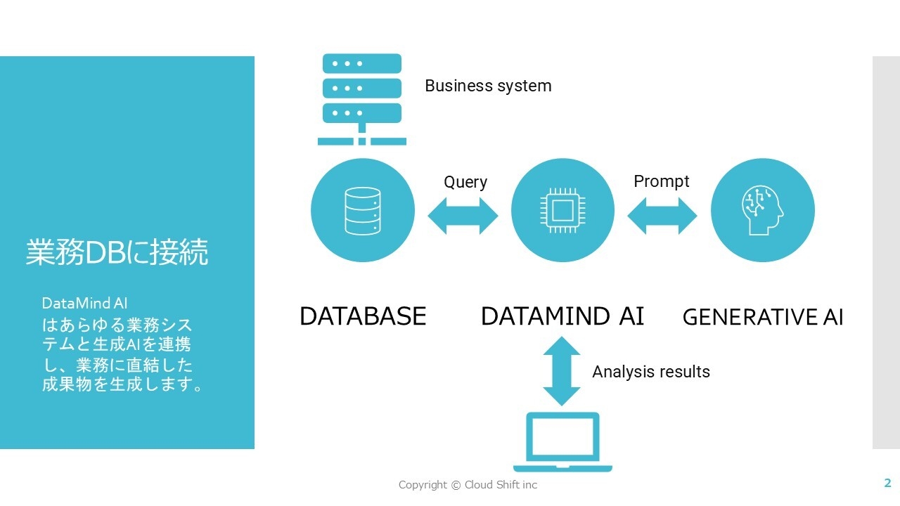 株式会社クラウドシフトは業務でAIを活用するためのRDB連携AIエージェント『DataMind AI』を発表しました。
