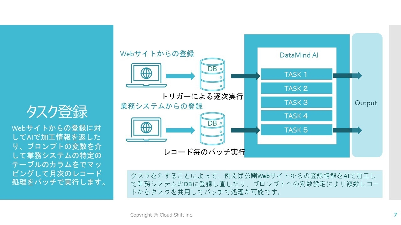 この検索→加工→登録をワンサイクルとしてタスク登録が可能で、プロンプトに変数を設けることによりWebサイトからの登録をトリガーとしてデータを加工して業務システム側のデータベースへ取り込んだり、月次処理等複数レコードの情報を書き換えてバッチ処理を行うことができます。