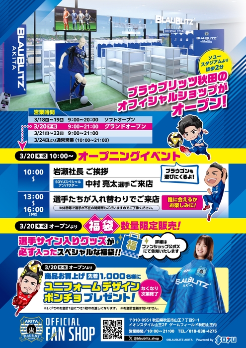 イオンスタイル山王2Fに「ブラウブリッツ秋田オフィシャルファンショップ」がオープン 先着1000名様に「ユニフォームデザインポンチョ」をプレゼント