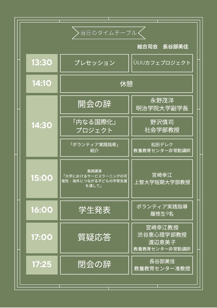 神奈川県秦野市で学生による海外につながる子どもの学習支援を長年にわたって実践してきた上智大学短期大学部から宮崎幸江教授をお招きし、その基調講演で「大学におけるサービスラーニングの可能性」を学びます。その後、実際にボランティア活動を通じて子どもたちと交流した本学の学生たちの学びについて具体的な報告があります。