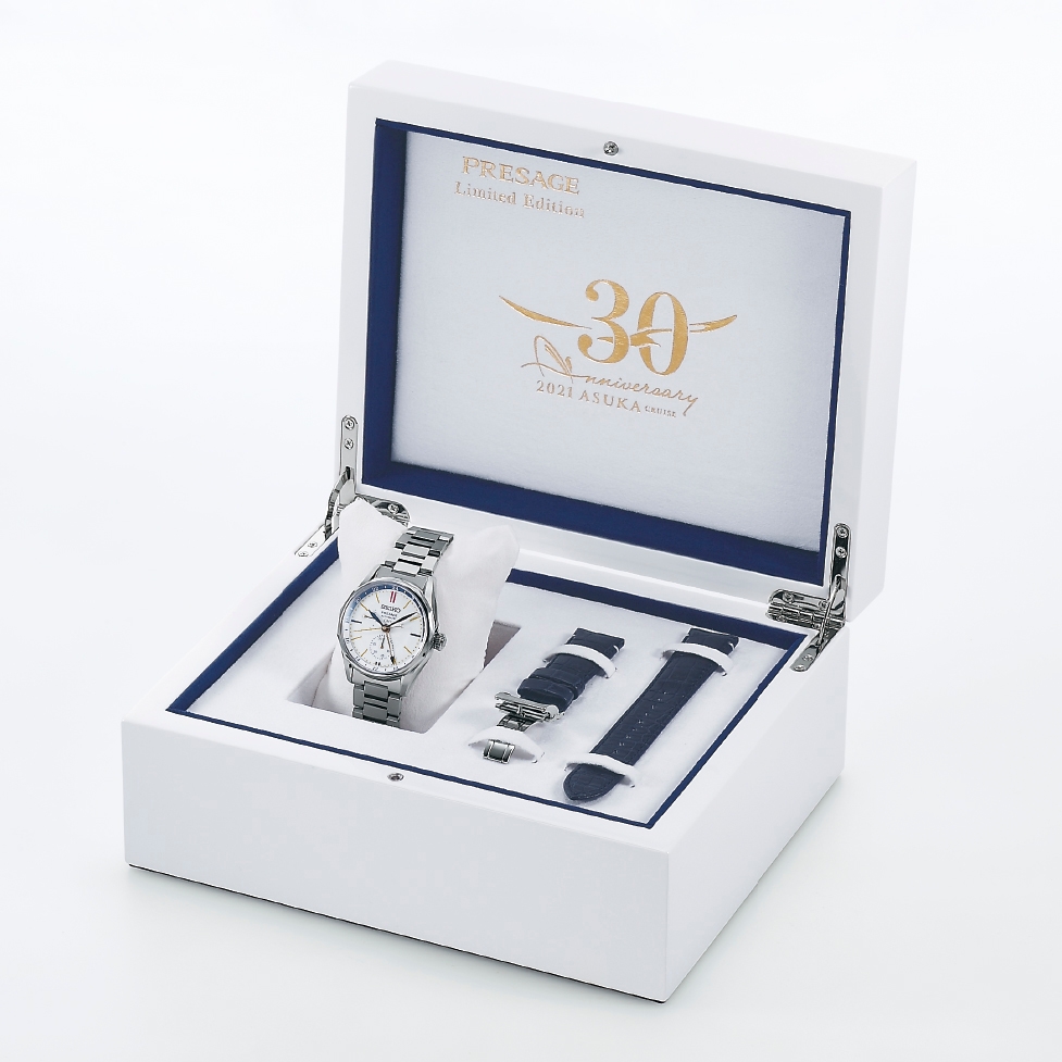 飛鳥IIの真っ白な船体を彷彿とさせる琺瑯ダイヤルや赤の二本線「二引き(にびき)」のデザイン、青・金のカラーリング、また裏ぶたには飛鳥クルーズのロゴが入っています。また今回は飛鳥クルーズ就航30周年を記念して、日付表示の「30」のメモリは金色でハイライトし、30周年のロゴ入りスペシャルボックスに入れてお届けします。