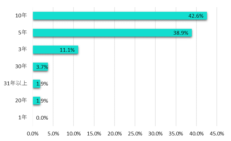5.4の質問で「事件、事故の発生から年数が経過」と答えた方に、「何年経った物件であれば住めるようになりますか?」と質問したところ、以下の回答となりました。(単数回答/n=54)