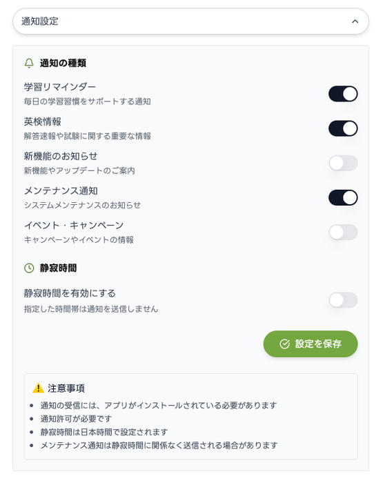 • 学習リマインダーの送信時刻をユーザー自身が設定できる機能