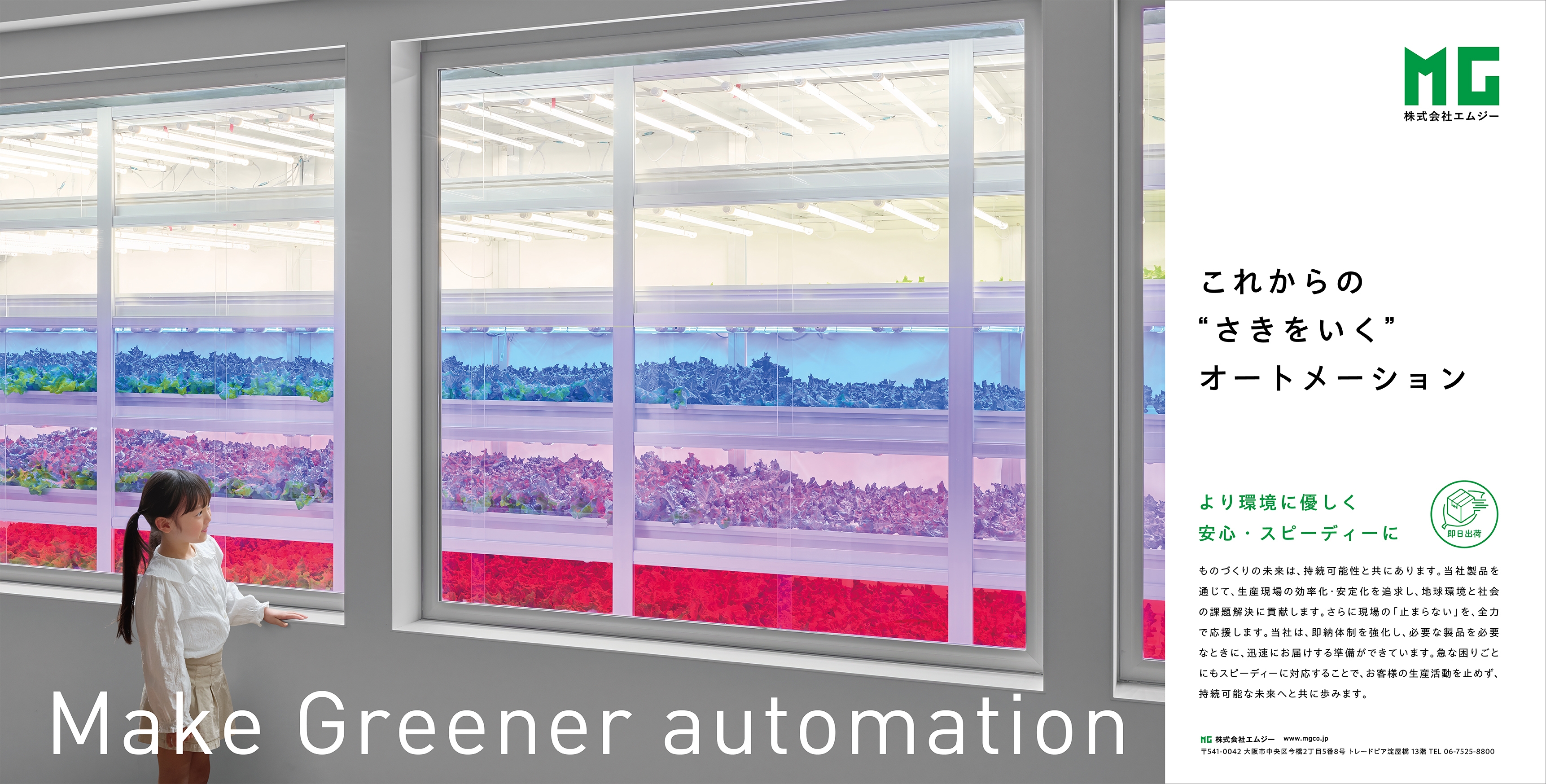 広告のキービジュアルには、未来を担う子どもが最先端の植物工場を見学するシーンを採用しました。植物学と光照射技術を融合させたこの施設は、「環境への配慮」と「生産効率」を両立する、次世代オートメーションの象徴です。子どもの真剣な眼差しを通して、持続可能なものづくりに向けた技術革新と社会的な責任を表現しています。