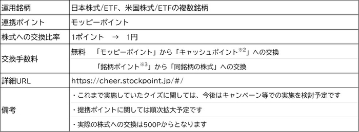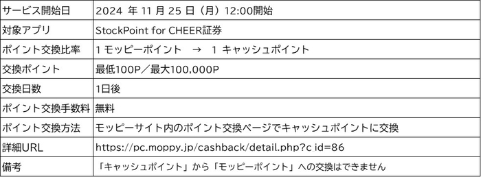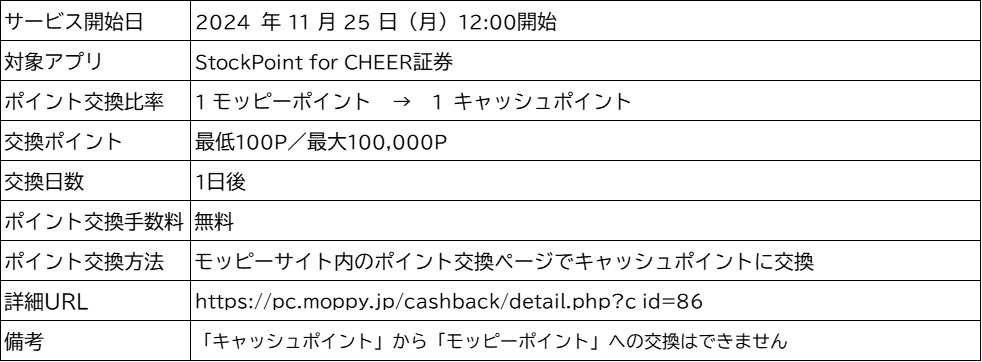STOCK POINT株式会社(本社:東京都港区、代表取締役社長:美好 琢磨、以下「STOCK POINT」)は、CHEER証券株式会社(本社:東京都中央区、代表取締役社長:小林 伸行、以下「CHEER証券」)と連携提供しているポイント運用アプリ『StockPoint for CHEER証券』のリニューアルに伴い、株式会社セレス(本社:東京都渋谷区、代表取締役社長:都木 聡、以下「セレス」)が提供する「モッピーポイント」とのポイント連携を開始いたします。