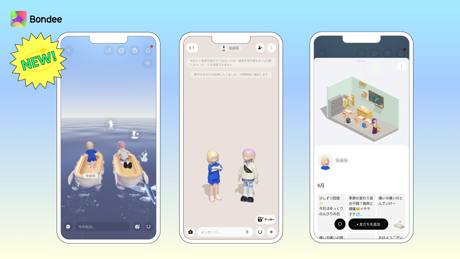 『Bondee ボンディー』は、自分のアバターを作成し、50人の友だちと密なコミュニケーションができる次世代メタバースSNSです。