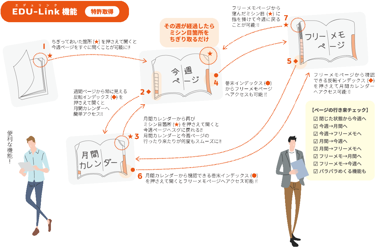 そこでACTIO手帳では、この課題を解決するためにGOOD DESIGN賞受賞歴のある手帳デザイナーが独自で考案した特殊な「EDU-Link機能(エデュリンク)」を開発いたしました。この機能は、上記のポピュラーな「月間群→週間群→フリーメモ群」のページ構成はそのままの状態で、各ページ群との間でスムーズに行き来できる特殊な構造となっています。そのため、長年の課題だった月間カレンダーと週間ページとの併用も容易にこなすことができる、今までになかった特殊な機能となります。さらに、当機能は2020年9月に特許を取得いたしました。