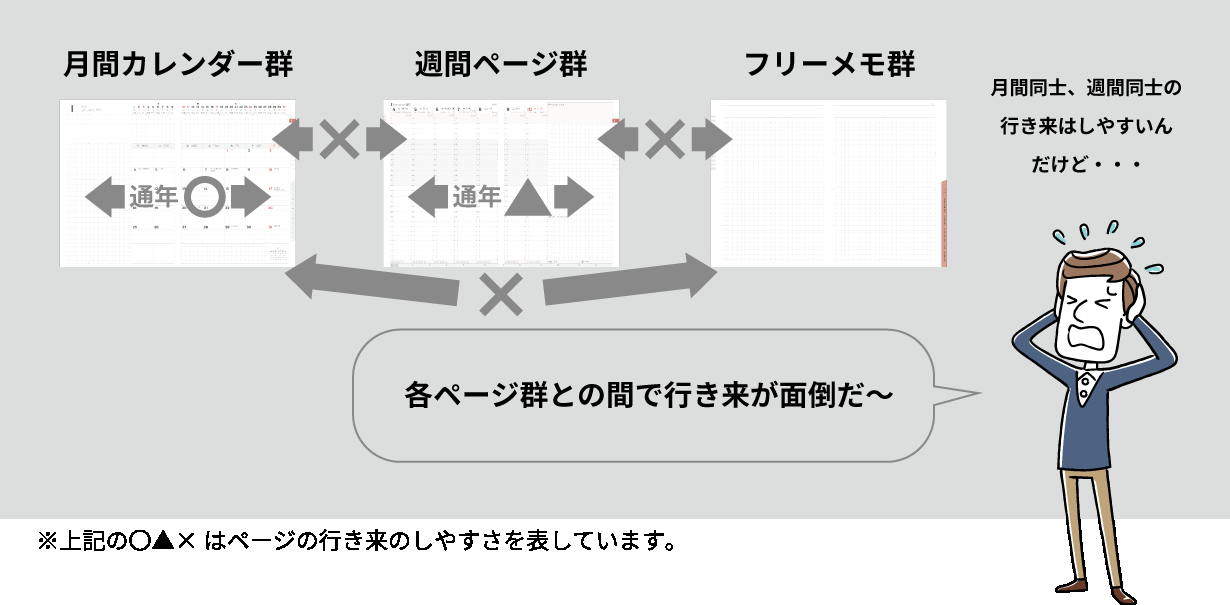最もポピュラーなビジネス手帳のページ構成は、「通年の月間群→通年の週間群→フリーメモ群」の流れで3部構成になっている手帳ですが、それぞれのページ群が離れているため、ページを行き来することがユーザー様にとってのストレスでした。そしてその影響から、月間カレンダーと週間ページとの併用がしにくいといった課題も当ページ構成の手帳で解決できないまま現在にいたっています。