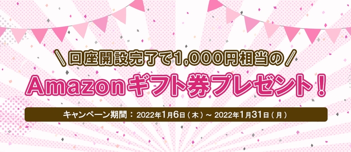 キャンペーン期間中、新規口座開設を完了したお客様(先着100名様)に、Amazonギフト券1,000円相当をプレゼント