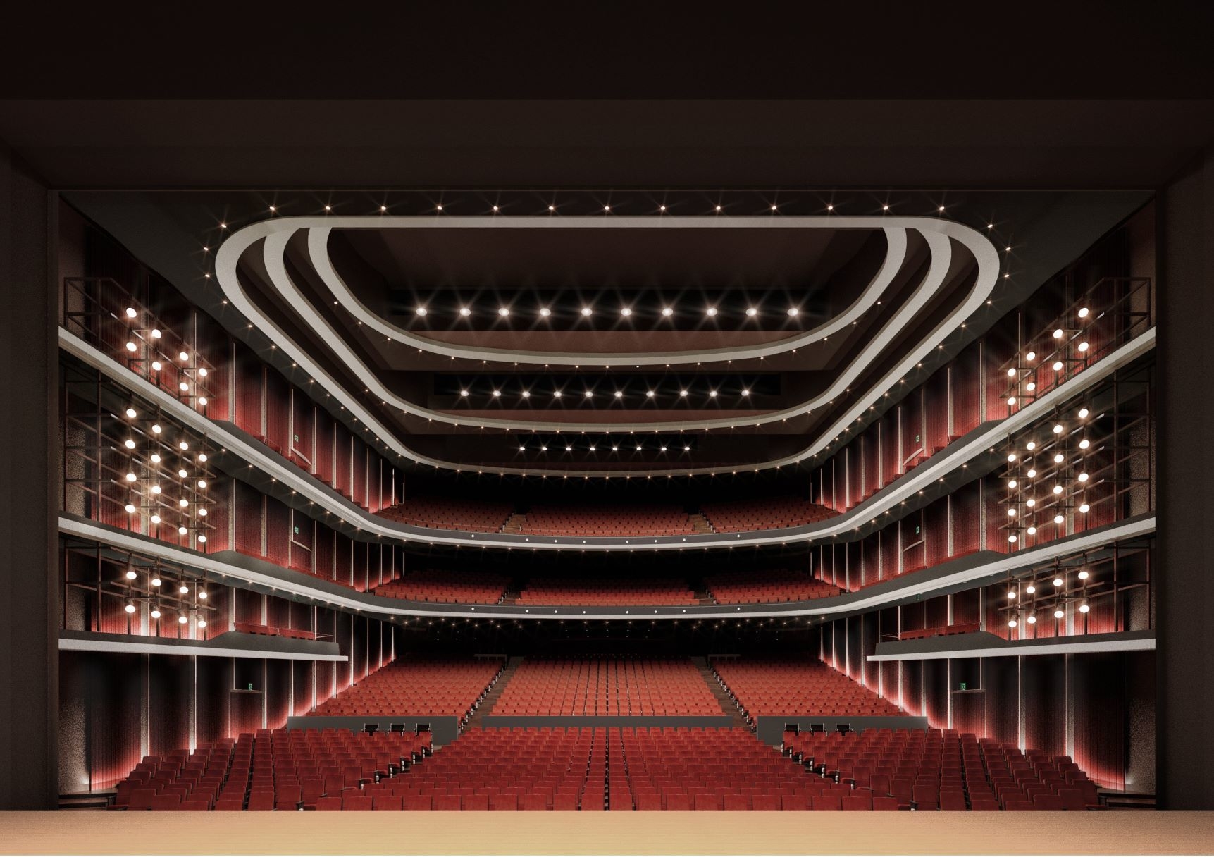 大(約1,750席)・中(約800席)・小(約300席)の3つの劇場に加え、大小の10を超える練習室、舞台や衣装の製作工房も備えます。