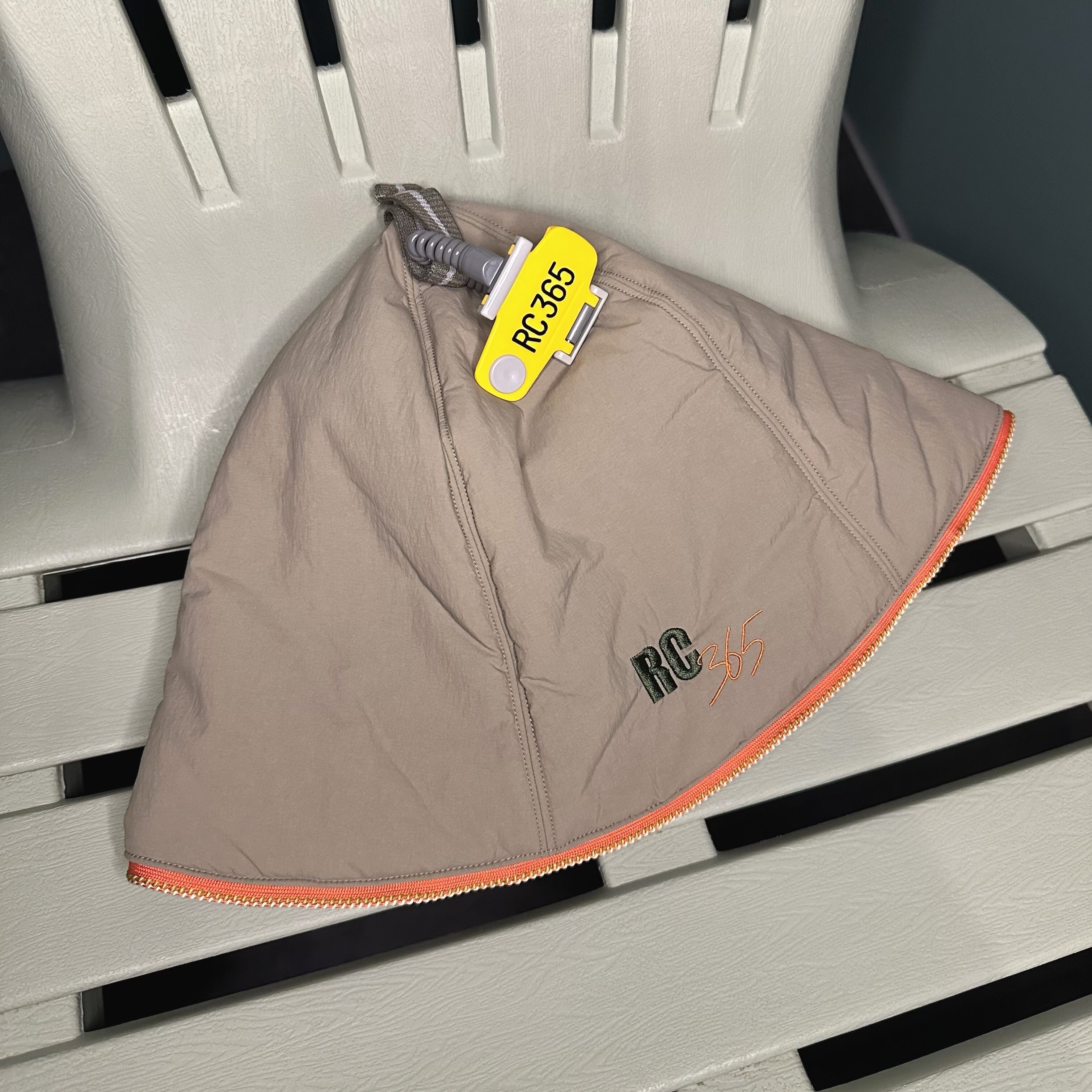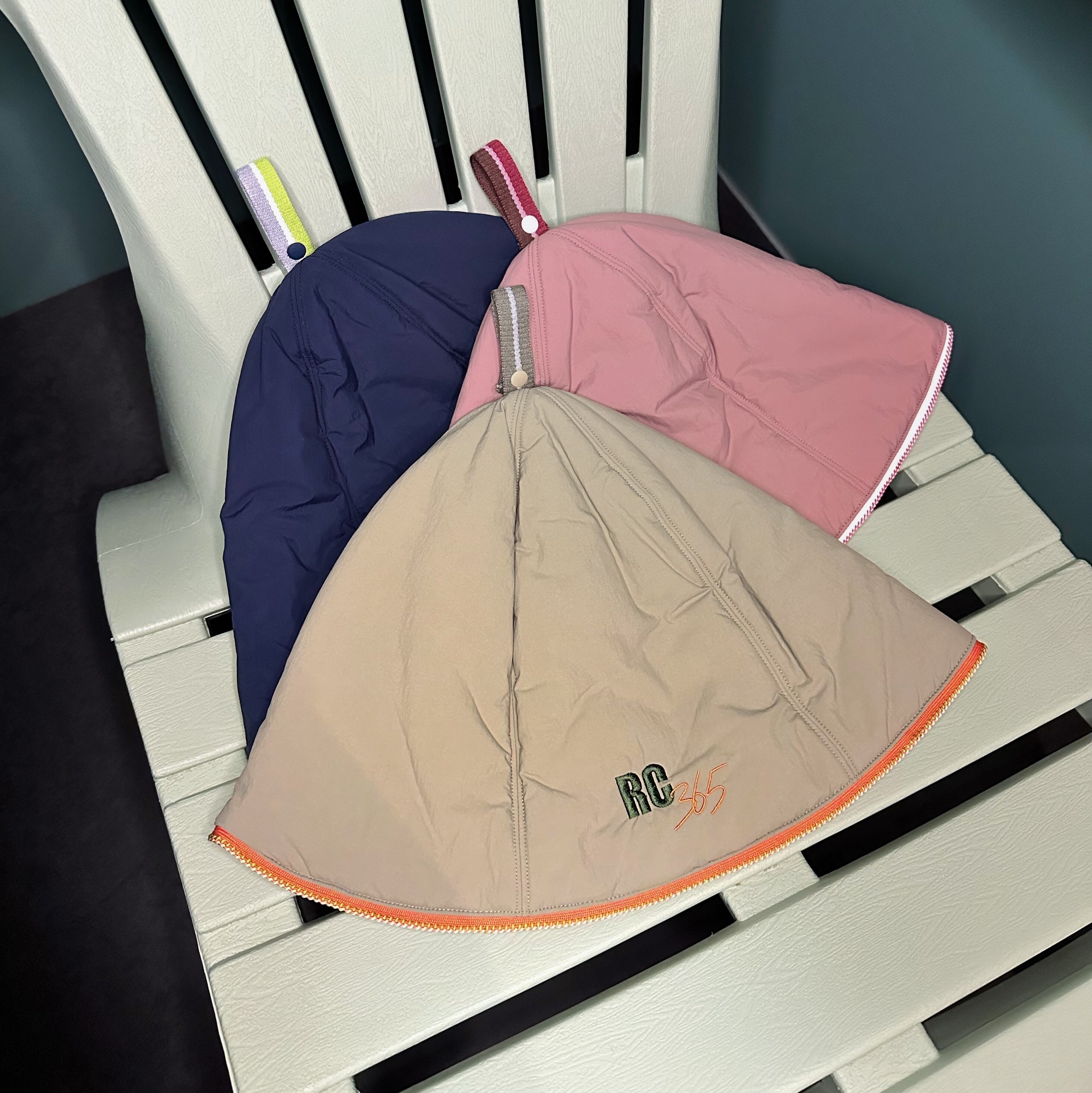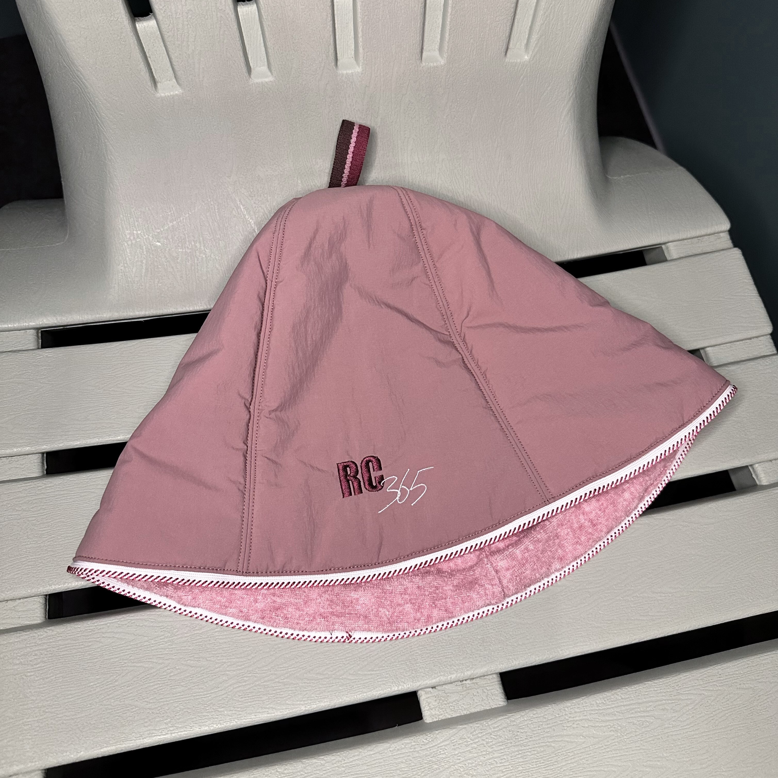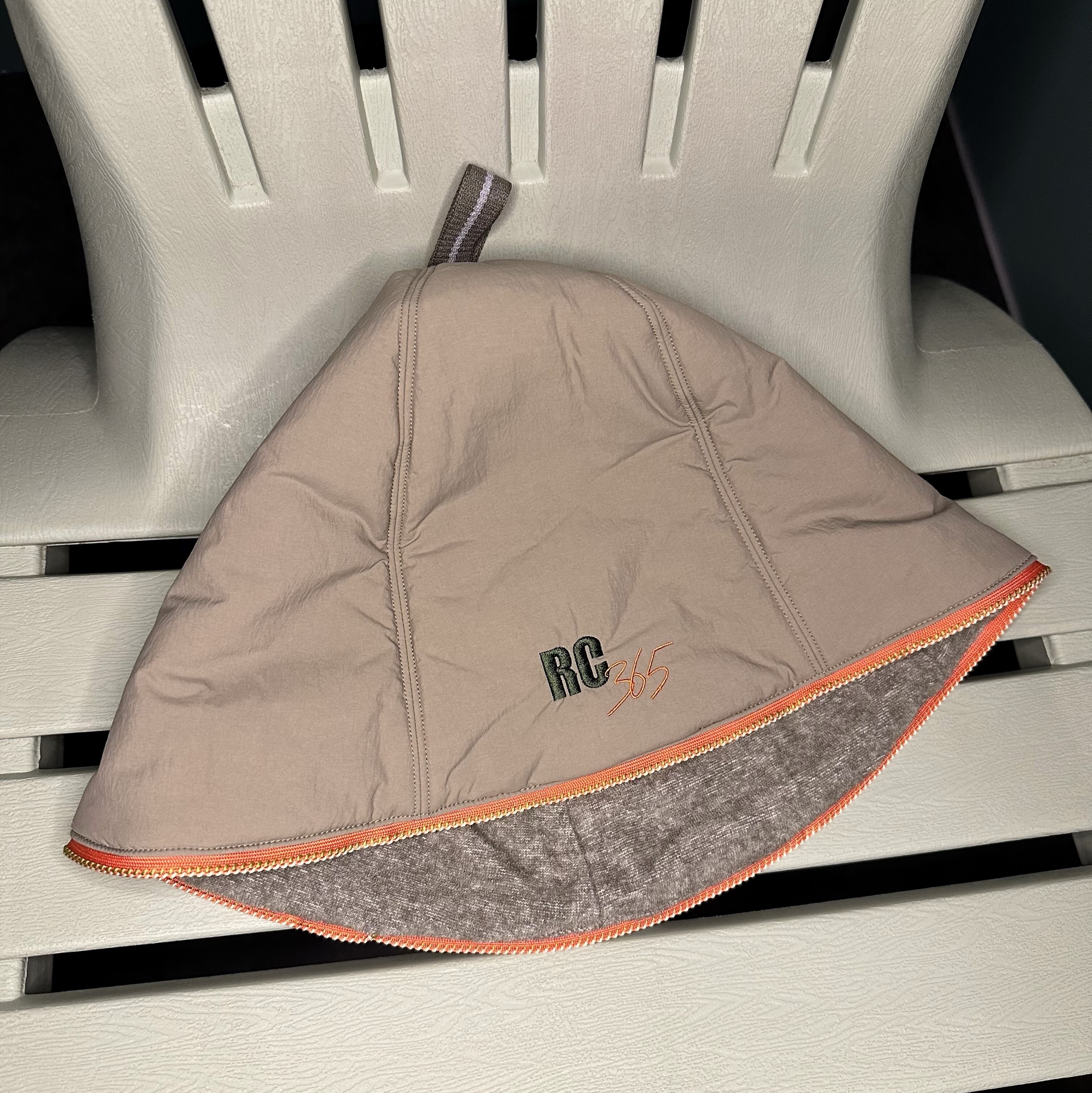 多い時で月20回サウナに行くほど、サウナ大好きデザイナーが毎日使いたいおしゃれで機能性抜群のサウナハットを作りました。表地は100%リサイクルナイロン、裏地はオーガニックコットン。中綿には断熱性・保温性に優れた素材「シンサレート」を使用。機能性に優れているRC365のサウナハットは、熱から髪の毛や顔をきっちり守る深めの作りとなっている。