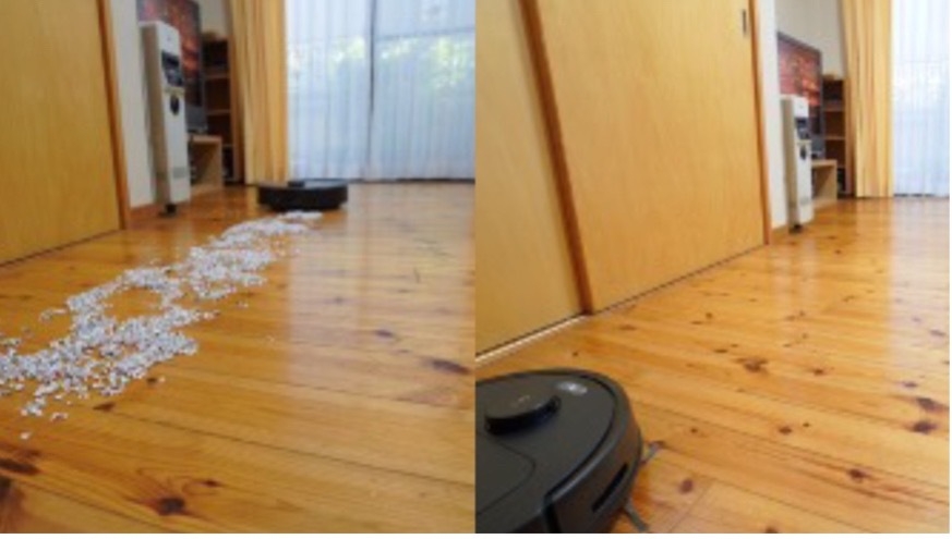 実際にゴミをまとめておくと、強力な吸引力で吸い込んでいきます。近辺のエリアを数往復して入念に掃除してくれるので、細かいゴミの取り残しもありません。