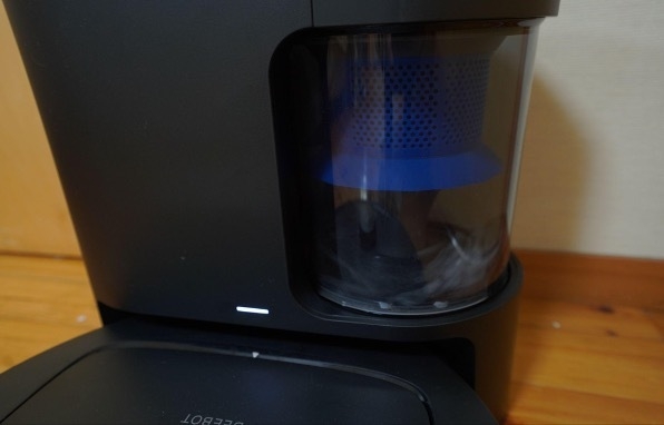 掃除を終えてゴミステーションへ戻ると、ステーションがDEEBOT N20 MAX PLUSのゴミを吸引します。本機が26,000Paの強力な吸引力で、人の手を介さず自動でゴミ収集を完了させました。