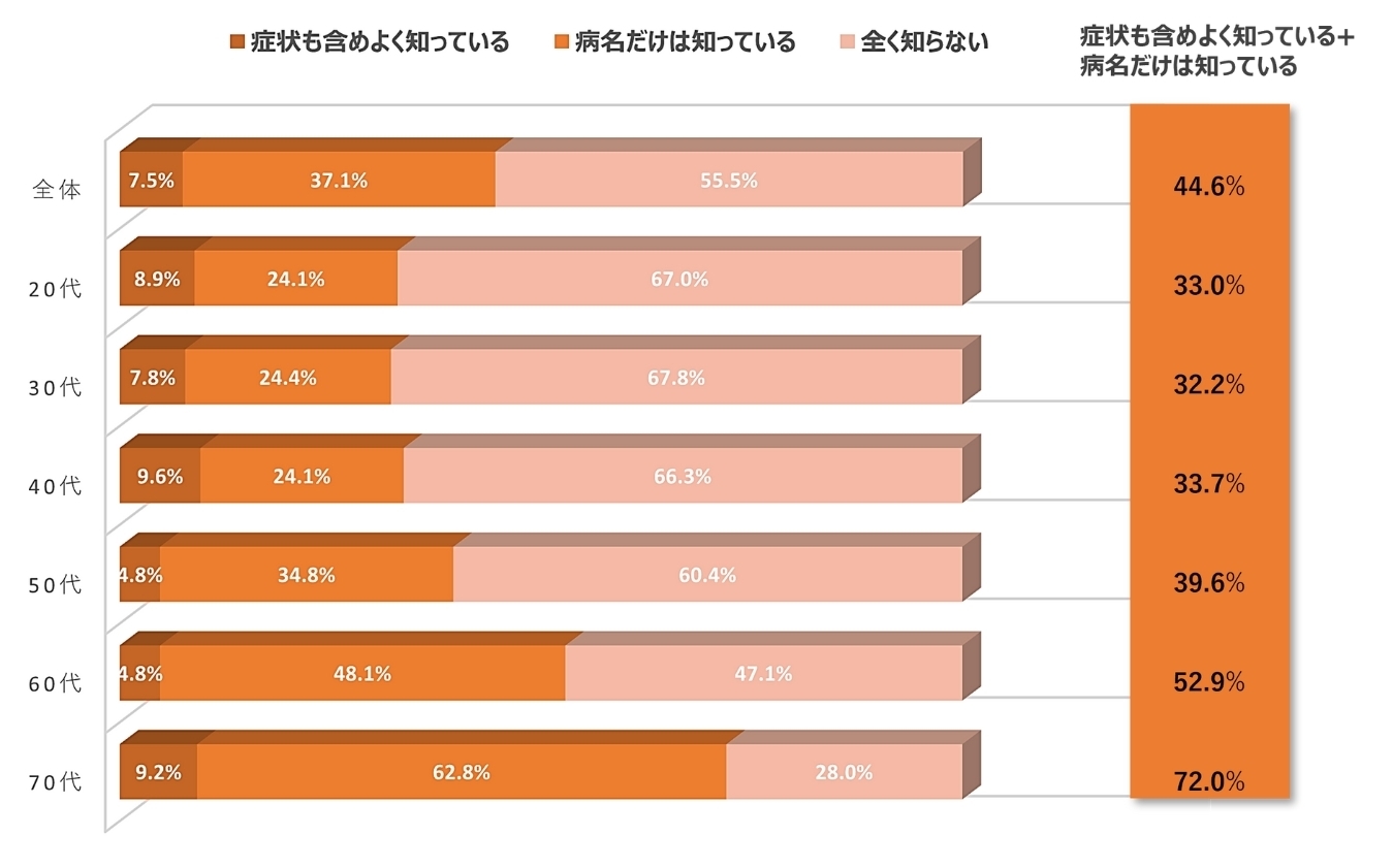 ・疾患認知度は全体で44.6%、年齢層が上がるにつれ認知度は向上 ・20~40代の認知度は3割程度であったが、 年代とともに向上し、70代では72.0%であった ・「症状を含めてよく知っている」は、全体で7.0%から7.5%に上昇
