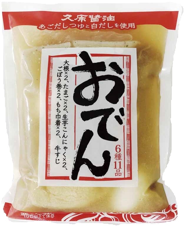 近年注目されているだしのひとつ「あごだし」は、“あごが落ちるほどおいしい”ことから呼び名がついたと言われています。再登場した「久原醤油あごだしと白だしを使用したおでん」は、久原醤油の「あごだし」と「あごだし入り白だし」を使ったライフオリジナルのチルドおでんです。生芋こんにゃく・もち巾着・牛すじなどこだわりの具材が6種11品入って食べ応え抜群です。
