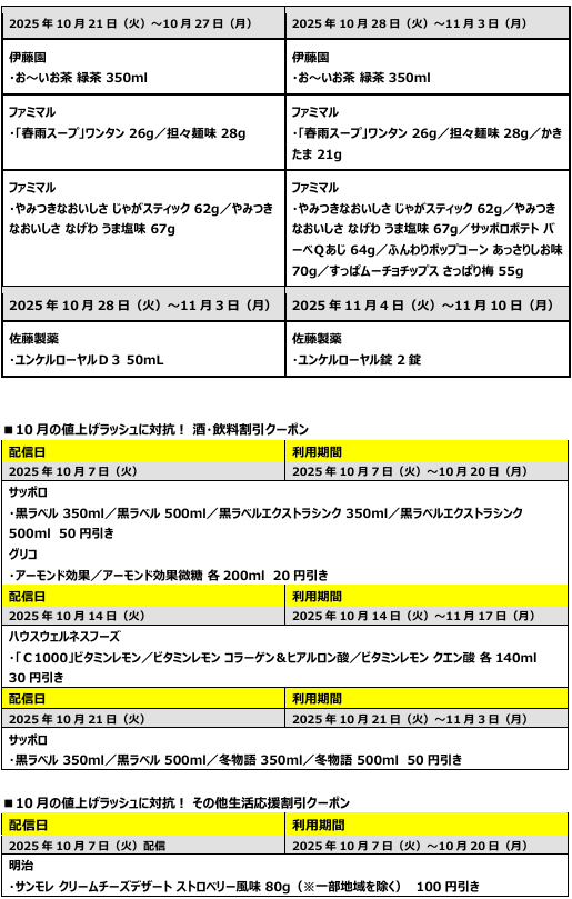 10月も生活応援!値上げ品目数最多の飲料、酒含む140種類以上のクーポン配信