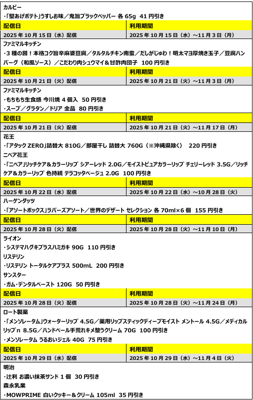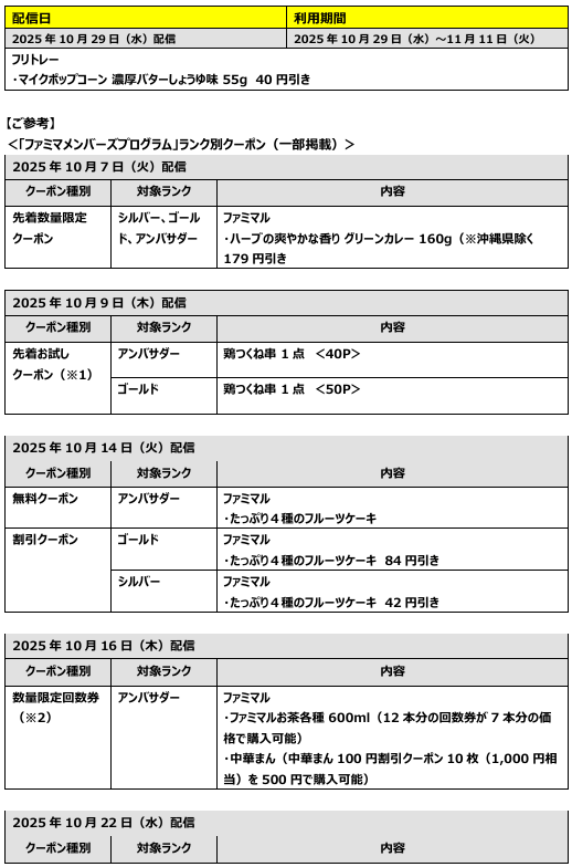 株式会社ファミリーマート(本社:東京都港区、代表取締役社長:細見 研介)は、継続して取り組んでいる5つのキーワードのうち「たのしいおトク」、「『あなた』のうれしい」の一環として、ファミマのアプリ「ファミペイ」(以下、ファミペイ)内で「1個買うと、1個もらえる」キャンペーンを2025年10月7日(火)から全国のファミリーマート約16,300店にて実施いたします。さらに、食品や飲料など約140種類以上の割引クーポンを順次配信いたします。10月は約3,000品目の食品が値上げする中、ファミペイを通じてお客さまの生活を応援いたします。