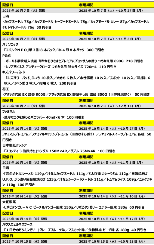 さらに、お菓子やカップ麺、冷凍食品などの加工食品のほか、洗剤やトイレットペーパーなど生活に欠かせない日用品のクーポンも順次配信予定です。