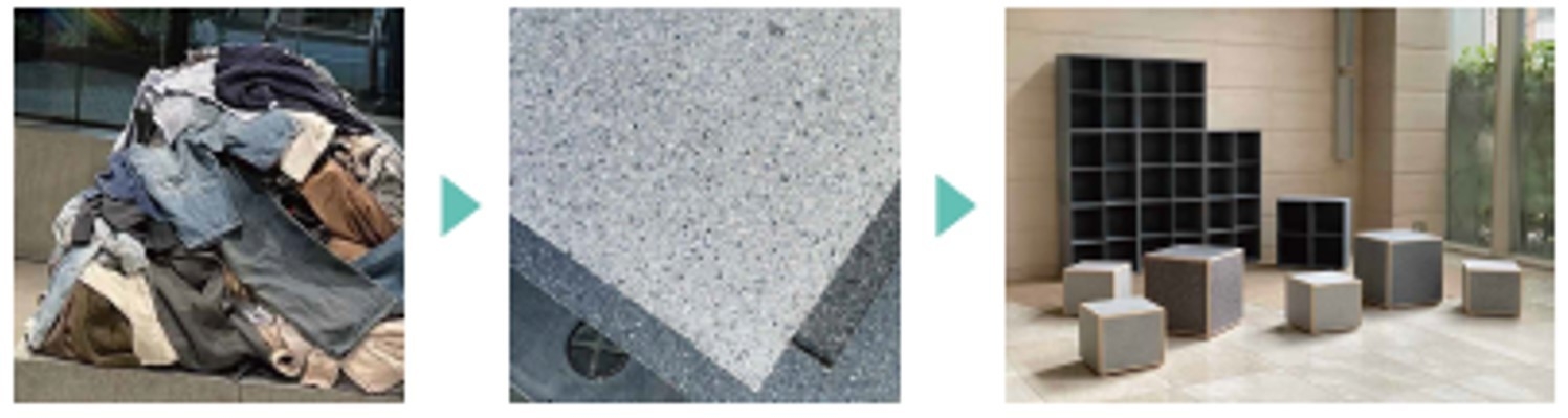布だけではなく合成皮革など廃棄衣料品に含まれるさまざまな繊維をアップサイクルすることができる繊維リサイクルボード。硬度があり加工しやすく、店舗やオフィスなどの様々な空間の内装、ディスプレイ什器、家具など、多様な目的に使用することができ、使用後も再びボードとしてリサイクルすることができる。