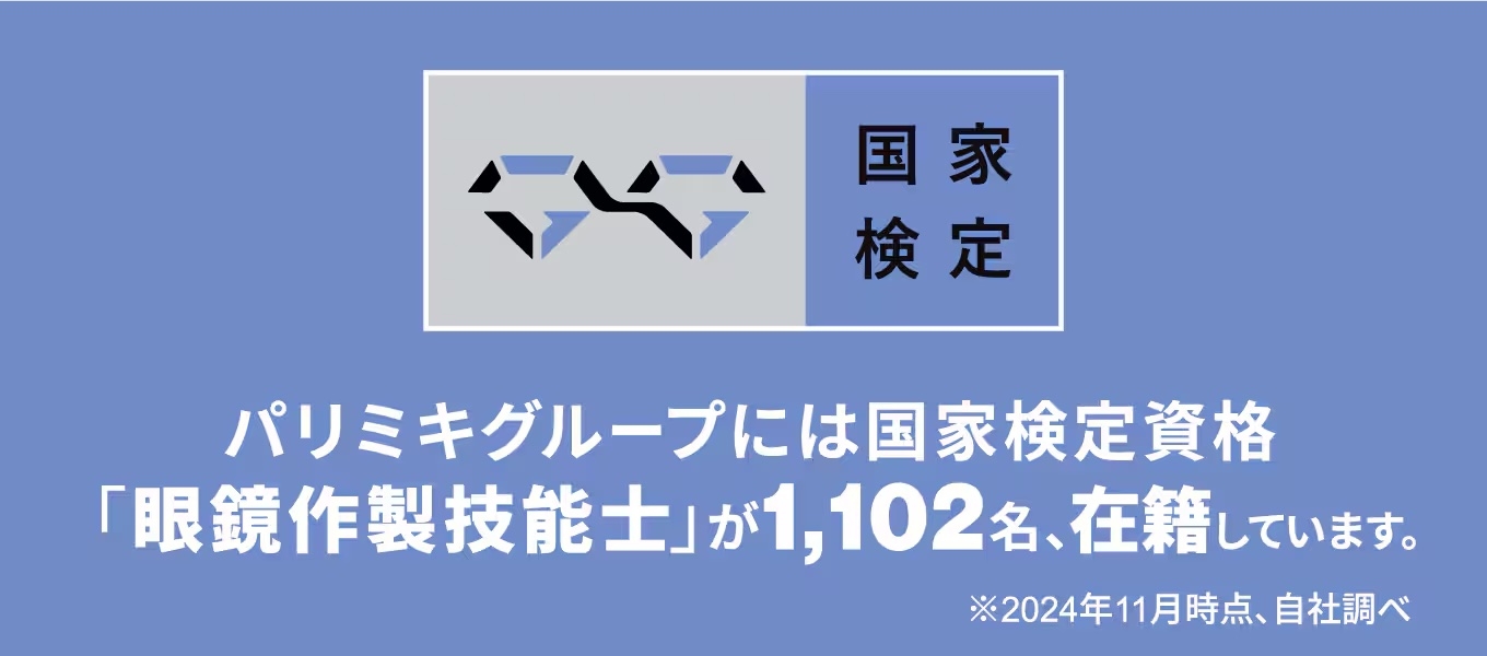 2022年4月より、国の定める「技能検定」の職種に「眼鏡作製職種」が新設され、国家検定資格「眼鏡作製技能士」がスタートし、パリミキグループでは現在1,102名の合格者が在籍しています。(※2024年11月時点、自社調べ)多様化・高度化するお客様のニーズにあわせて、「適切な診断・治療」と「適切な眼鏡作製」の双方の実現に向け、眼鏡技術者が眼科専門医と連携しつつ、皆様により良い眼鏡を提供し、目の健康を守れるよう、眼鏡作製の技能を高めてまいります。