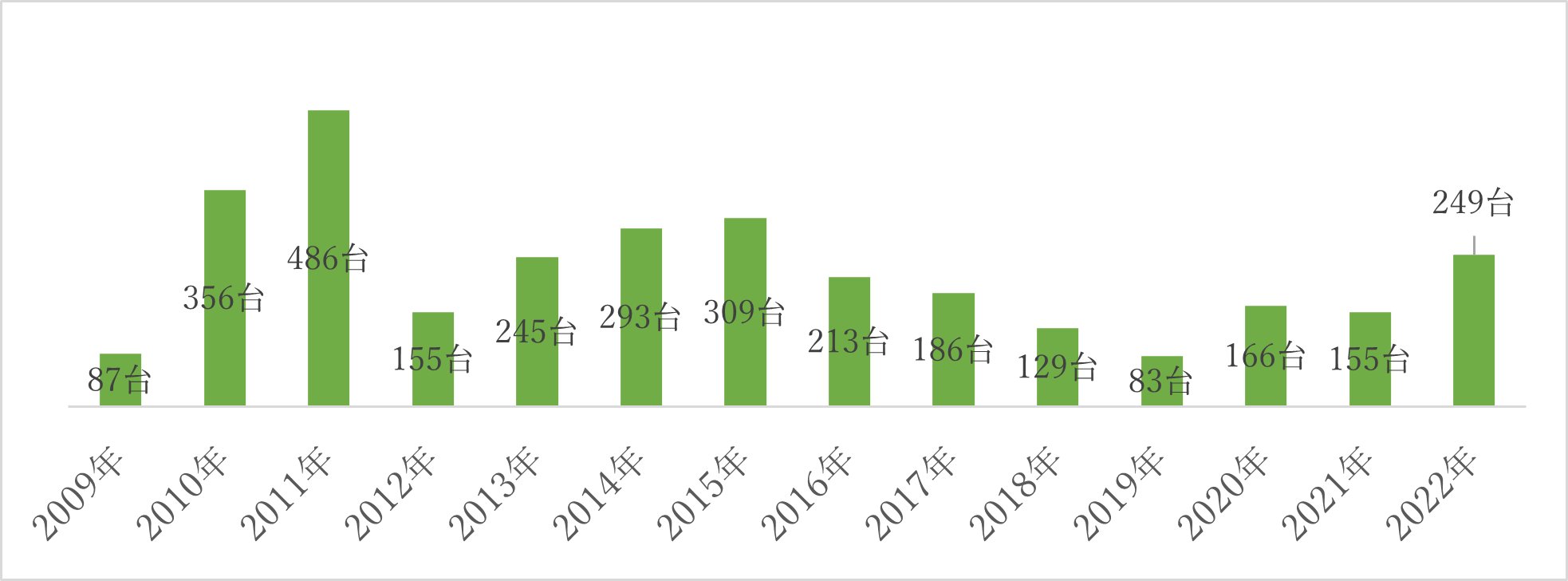14年で累計(1月~12月起算)は3,100台を超えました。