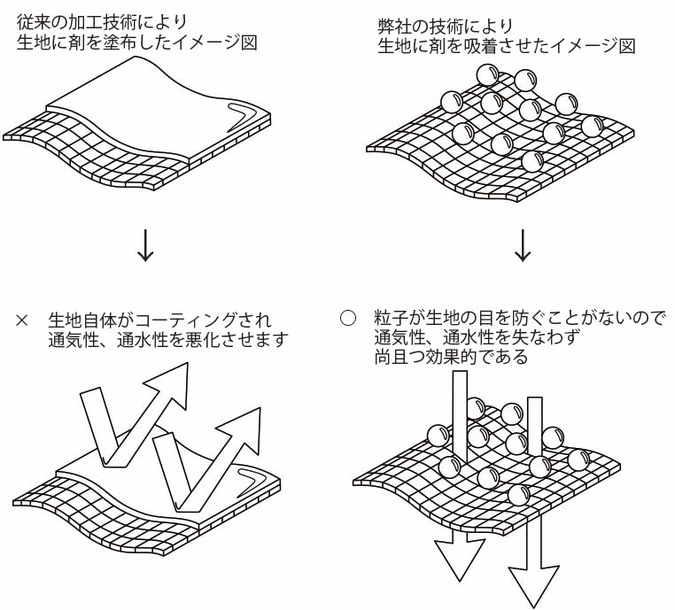 塗布とは違いミクロサイズの粒子にして吸着する事で素材の構造を邪魔せず、通気性、通水性を失う事なく吸着した効果を得ることができます。