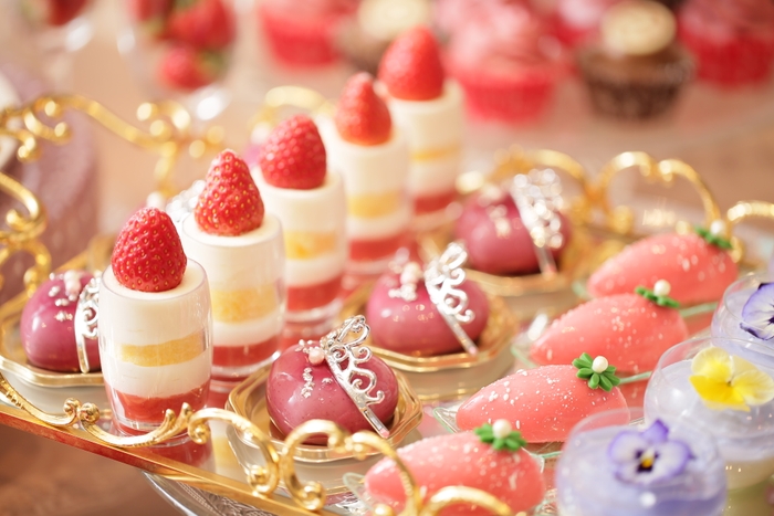 ガラスの靴といちごティラミス・シンデレラショートケーキ・ストライプロールケーキ・いちごたっぷりタルト・いちごとピスタチオのパリブレスト・タイベリーのハートムース・ストロベリームース・あまおうのキャンドルヴェリーヌ・ハーブティーのパンナコッタ・いちごプディング・カヌレ・マカロン2種(いちごとレモン)・サブレバニラ・季節のアイスクリーム・いちごとチョコのマフィンタワー・王様のチョコレートムース・プリンセス&プリンス ストロベリー食べ放題 など約20種