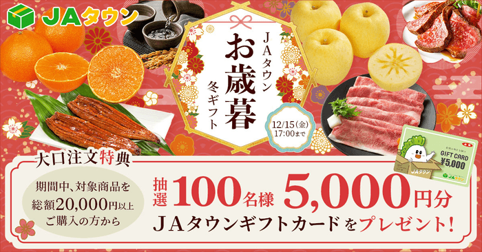 このキャンペーンは、10月2日(月)から12月15日(金)の期間で開催し、期間中、対象商品を総額2万円以上ご購入いただいた方の中から抽選で100名様に、JAタウンギフトカード5,000円分をプレゼントします。