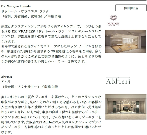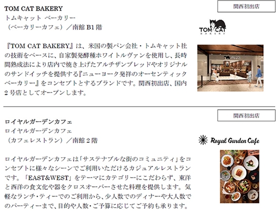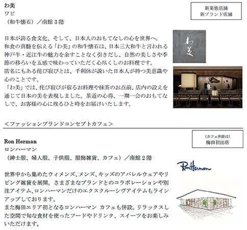 ※炭焼き うな富士(鰻料理店)、(仮称)寿司うめきた(寿司店)、RUTH'S CHRIS STEAK HOUSE(西洋スタイルの高級ステーキ店)、BRIANZA OSAKA(イタリア料理店)、わ美(和牛懐石)、京都祇園 天ぷら圓堂(天ぷら料理店)