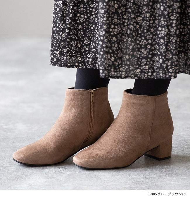 コーデに合わせやすいベーシックデザインのショートブーツ。 安定感抜群のチャンキーヒールで歩きやすさもキレイ見せも叶えてくれる。