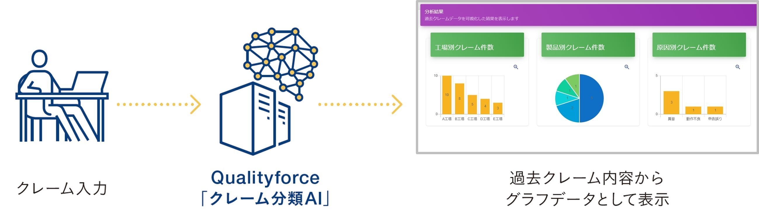 Qualityforceは、各メーカーがデータベースに蓄積している過去クレームの「症状・原因・対策」をAIが分析し、新たに寄せられたクレームに対する「責任の所在」、「原因の推定」、「取りうる対策とその根拠」を即座に提示することで、クレームへの初動対応を強力に支援するITシステムです。